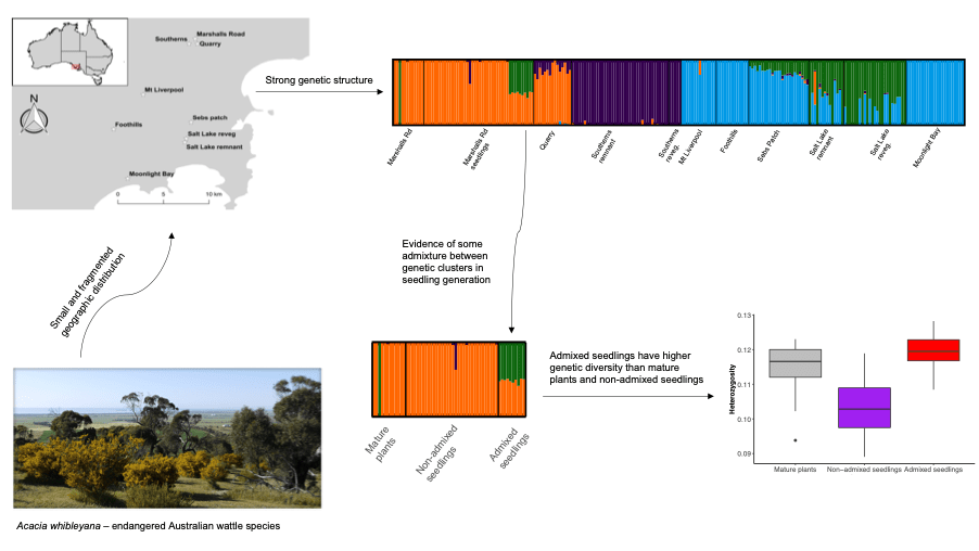 Gathering all her experience, Colette then moved to Adelaide where she had the pleasure of meeting me (not really, the pleasure was all mine) and here she started her PhD. Colette has one of the most fascinating PhD projects, she is using genomic analyses to identify breaks in gene flow, levels of inbreeding and genetic diversity, and adaptation to climate and environment in native Australian plant species. She can then directly use this to provide practitioners with seed sourcing recommendations by selecting seed which has a greater chance of survival in the future. Pretty cool hey! This kind of work is exactly what we need right now as climate change is really being felt worldwide. We don’t have time to make mistakes or take chances with restoring native vegetation, we need to do it now and we need it to work. Colette’s PhD project is working towards enabling us to do this (you can read her recent paper here).